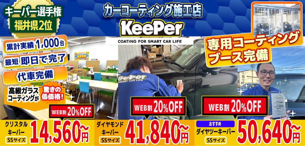 私達キーパーは、福井市・鯖江市・坂井市・越前市・丹生郡越前町・あわら市・吉田郡永平寺町エリアのカーコーティング専門店として、日本ダントツのカーコーティングブランド、キーパーの取扱店として認定を受けております!
